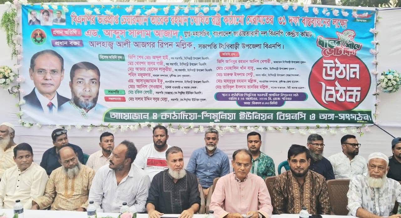 টিটু চৌধুরী টঙ্গীবাড়ী প্রতিনিধি: বাংলাদেশ জাতীয়তাবাদি দল (বিএনপি'র) ভারপ্রাপ্ত চেয়ারম্যান তারেক রহমান ঘোষিত রাষ্ট্র কাঠামো মেরামতের ৩১ দফা বাস্তবায়নের লক্ষ্যে মুন্সীগঞ্জের টঙ্গীবাড়ীতে উঠান বৈঠক অনুষ্ঠিত হয়েছে। কাঠাদিয়া শিমুলিয়া ইউনিয়ন বিএনপি ও অঙ্গ-সংগঠনের আয়োজনে শনিবার (২৫অক্টোবর) বিকেল ৪ টায় কাঠাদিয়া-শিমুলিয়া সরকারি প্রাথমিক বিদ্যালয়ের মাঠে এই উঠান বৈঠক অনুষ্ঠিত হয়। এসময় প্রধান অতিথি হিসেবে উপস্থিত ছিলেন বাংলাদেশ জাতীয়তাবাদি দল (বিএনপি'র) কেন্দ্রীয় কমিটির যুগ্ম মহাসচিব এডভোকেট আব্দুস সালাম আজাদ। প্রধান বক্তা হিসেবে উপস্থিত ছিলেন টঙ্গীবাড়ী উপজেলা বিএনপির সভাপতি আলহাজ্ব আলী আজগর রিপন মল্লিক। কে-শিমুলিয়া ইউনিয়ন বিএনপি'র ভারপ্রাপ্ত সভাপতি মো. রফিক বেপারীর সভাপতিত্বে ও কে-শিমুলিয়া ইউনিয়ন যুবদলের সভাপতি মো. সালাহ উদ্দিন সবুজ মোল্লার সঞ্চালনায় উঠান বৈঠকে আরো উপস্থিত ছিলেন উপজেলা বিএনপির সহ সভাপতি ভিপি শেখ মো.আব্দুল হাই, মো.খোরশেদ আলম গাজী, সাংগঠনিক সম্পাদক এডভোকেট আসাদুজ্জামান ইকু, জেলা কৃষক দলের সাধারণ সম্পাদক শহিদ মজুমদার, উপজেলা যুবদলের যুগ্ম আহবায়ক শাহজাহান বেপারী, সদস্য সচিব মহসিন খান বাবু,জেলা যুবদলের সাবেক সহ সাংগঠনিক সম্পাদক মো.রনি গাজী,উপজেলা স্বেচ্ছাসেবক দলের সদস্য সচিব মারুফ ইসলাম সেন্টু, জেলা ছাত্রদলের সাংগঠনিক সম্পাদক মাহবুব মল্লিক,বিটি কলেজ ছাত্রদলের সাবেক আহবায়ক তানভীর মল্লিক সহ উপজেলা ও ইউনিয়ন বিএনপি ও অঙ্গ সংগঠনের নেতাকর্মীবৃন্দ।