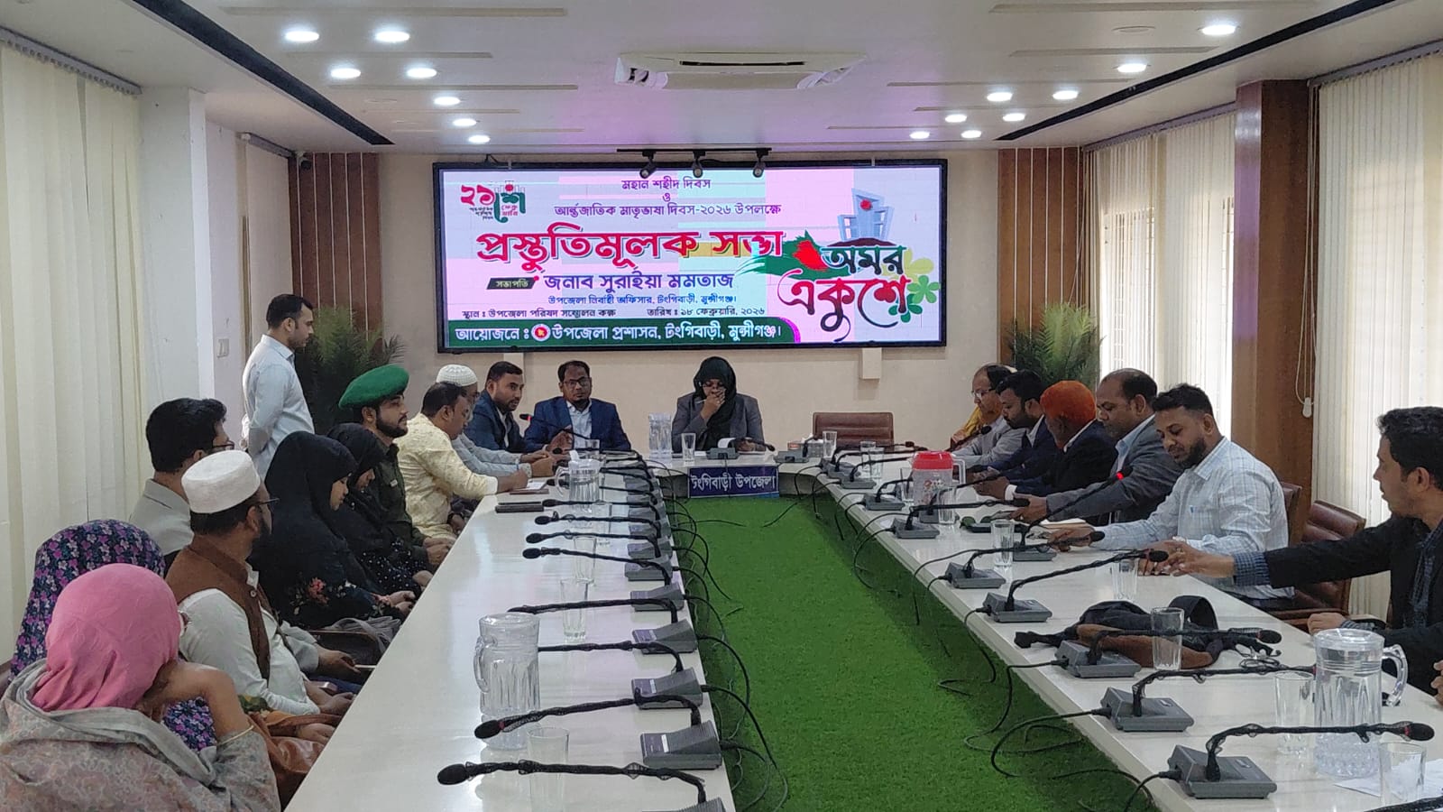 টঙ্গীবাড়ী উপজেলা নির্বাহী কর্মকর্তা সুরাইয়া মমতাজ এর সভাপতিত্বে সভায় আরো উপস্থিত ছিলেন উপজেলা স্বাস্থ্য ও পরিবার পরিকল্পনা কর্মকর্তা ডাঃ আব্দুল মালেক,উপজেলা প্রকল্প বাস্তবায়ন কর্মকর্তা স্বপন মাতাব্বর, উপজেলা শিক্ষা অফিসার শরিফ মোঃ এহসান মোরতেজা, মৎস্য কর্মকর্তা মোসাম্মত নিগার সুলতানা,টঙ্গীবাড়ী প্রেসক্লাবের সভাপতি মোজাফফর হোসেন শেখ,সাধারণ সম্পাদক মোঃ রনি শেখ,উপজেলা জনস্বাস্থ্য সহকারী প্রকৌশলী হুমায়ুন আহমেদ, আনসার ভিডিপি কর্মকর্তা মান্নান মৃধা সহ উপজেলার বিভিন্ন দপ্তরের কর্মকর্তাবৃন্দ, রাজনৈতিক ও সামাজিক সংগঠনের নেতৃবৃন্দ উপস্থিত ছিলেন। এসময় বক্তারা যথাযোগ্য মর্যাদায় ২১শে ফেব্রুয়ারি শহিদ দিবস ও আন্তর্জাতিক মাতৃভাষা দিবস-২০২৬ উদযাপনের লক্ষ্যে গুরুত্বপূর্ণ আলোচনা করেন।