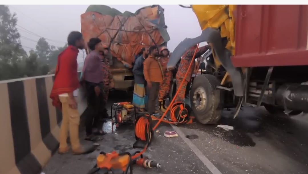 ফায়ার সার্ভিস ও স্থানীয় সূত্রে জানা গেছে, ভোর ৬ টার দিকে এক্সপ্রেসওয়ের মাওয়ামুখী লেনে একটি ট্রাক যান্ত্রিক ত্রুটির কারণে দাঁড়িয়ে মেরামত করা হচ্ছিল। এসময় মাওয়াগামী দ্রুতগতির অন্য একটি ট্রাক নিয়ন্ত্রণ হারিয়ে দাঁড়িয়ে থাকা ট্রাকটির পেছনে সজোরে ধাক্কা দেয়। এতে সামনের ট্রাকের হেলপার ছিটকে পড়ে আহত হন এবং পেছনের ট্রাকের হেলপার কেবিনের ভেতরে আটকা পড়েন।