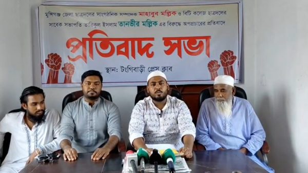 টঙ্গীবাড়ী প্রতিনিধি: ছাত্রদল নেতা মাহবুব মল্লিক ও তানভীর মল্লিকের বিরুদ্ধে জমি দখলের মিথ্যা অপবাদ দিয়ে সামাজিক যোগাযোগমাধ্যম ফেসবুকে পরিকল্পিতভাবে অপপ্রচার চালানোর প্রতিবাদে এক প্রতিবাদ সভা অনুষ্ঠিত হয়েছে। বুধবার বিকেল