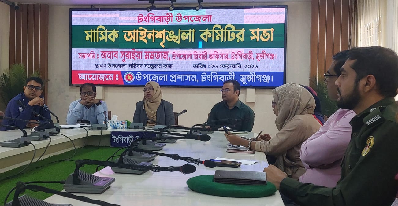 টিটু চৌধুরী টঙ্গীবাড়ী প্রতিনিধি: মুন্সীগঞ্জের টঙ্গীবাড়ী উপজেলায় মাসিক আইনশৃঙ্খলা কমিটির সভা অনুষ্ঠিত হয়েছে। উপজেলা প্রশাসনের আয়োজনে বৃহস্পতিবার সকাল ১০ টায় উপজেলা পরিষদ সভাকক্ষে অনুষ্ঠিত এ সভায় সভাপতিত্ব করেন উপজেলা নির্বাহী কর্মকর্তা (ইউএনও) সুরাইয়া মমতাজ।