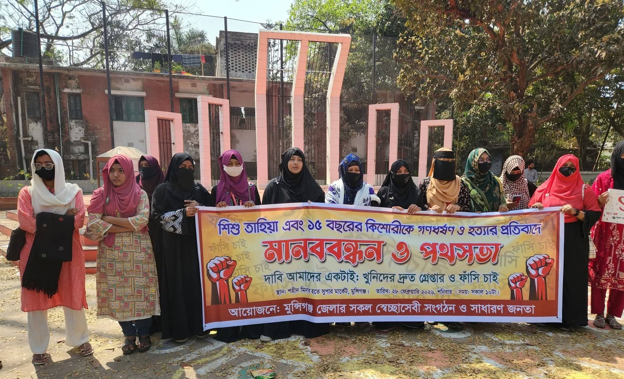 রাজধানী ঢাকা-এ ছয় বছর বয়সী শিশু তাহিয়াকে নির্মম নির্যাতনের পর হত্যা এবং নরসিংদী-তে ১৫ বছর বয়সী এক কিশোরীকে সংঘবদ্ধ ধর্ষণের পর হত্যার ঘটনাসহ দেশজুড়ে ঘটে চলা নারী ও শিশু নির্যাতনের প্রতিবাদে মানববন্ধন ও পথসভা কর্মসূচি পালন করেছে ‘মুন্সিগঞ্জ জেলার সকল স্বেচ্ছাসেবী সংগঠন ও সাধারণ জনতা’।